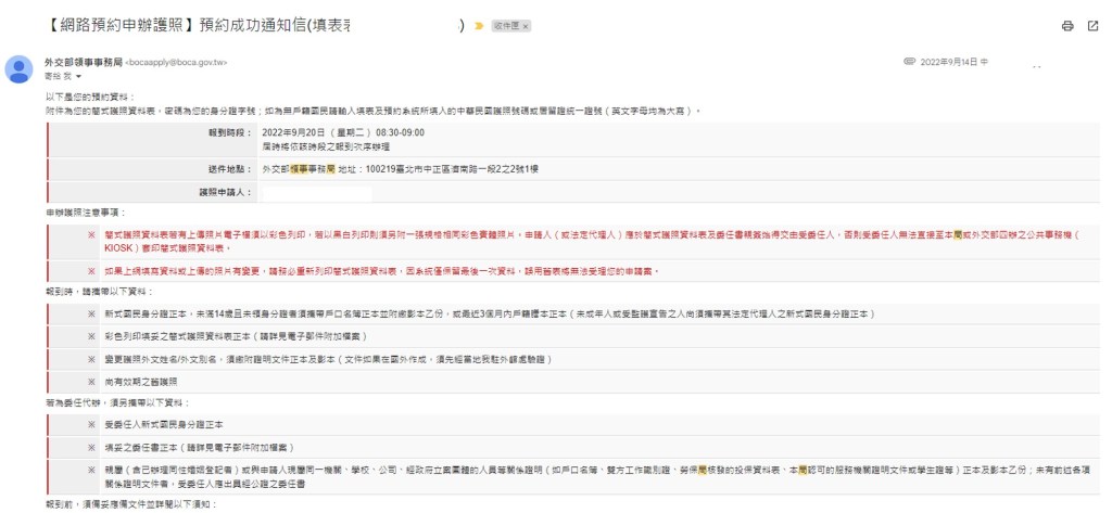 按照步驟填寫完,大概幾分鐘就會收到預約成功通知信,信件資訊也都很清楚的說明時間、地點、準備物品,也有附上線上申請的檢視護照資料表檔案,印出帶去或是現場網路預約報到印也可以。