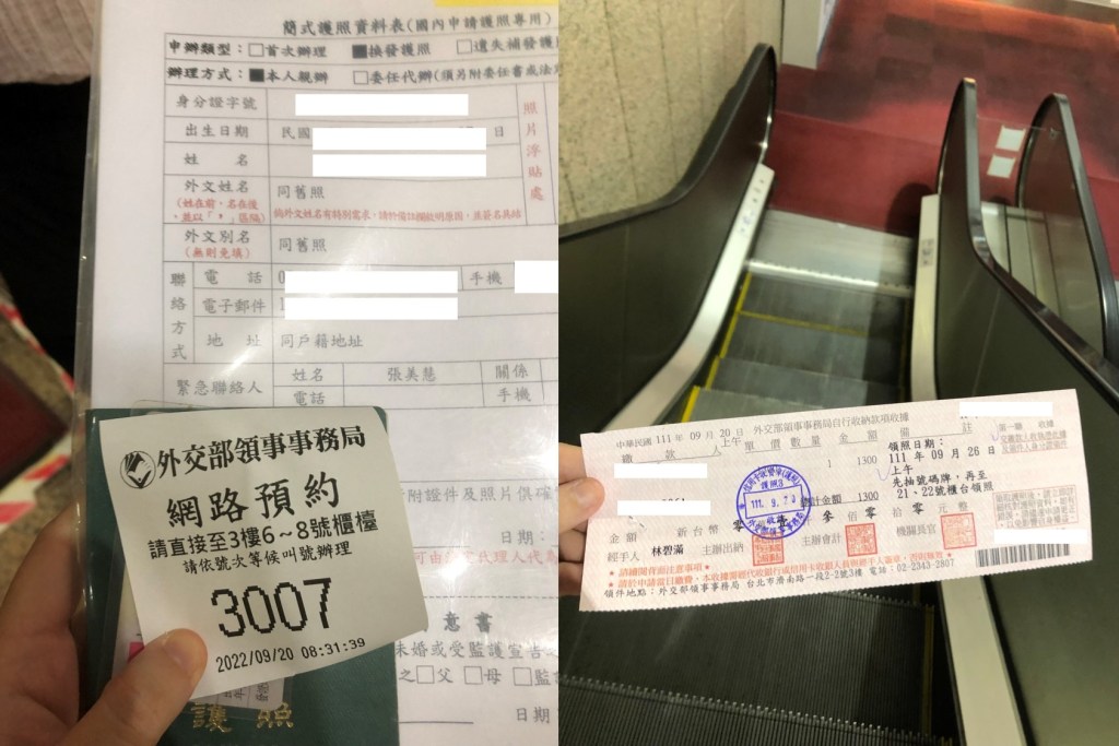 所以可以「事先網路預約申辦」超級開心,省去在現場大排的時間,我自己是網路先預約申辦,到現場繳資料大概30分鐘以內。領護照當天更快,不過要早一點去排隊就是了(我自己是8:30以前到,排上手扶梯的隊伍就已經很長了)。